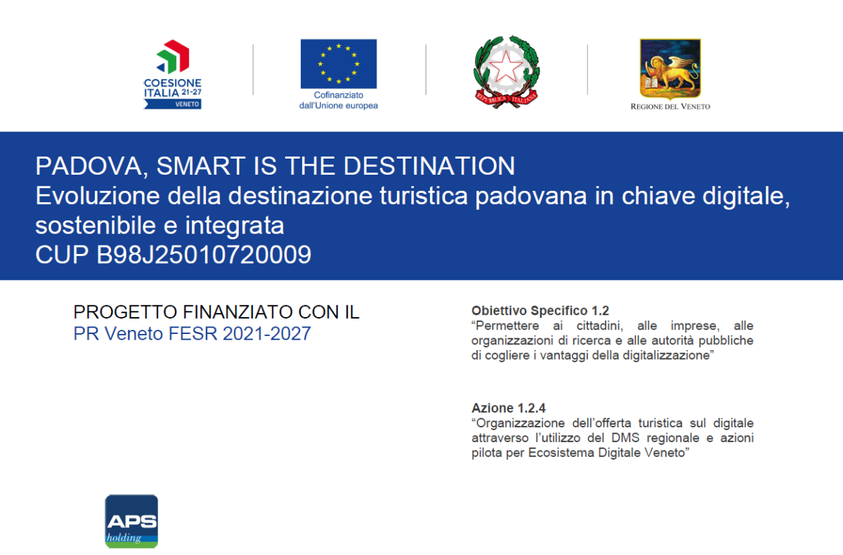 Il progetto “Padova: Smart is the Destination” ha l’obiettivo generale di accompagnare la destinazione turistica padovana in un percorso di evoluzione verso un modello di Smart Tourism Destination, attraverso un sistema integrato di soluzioni digitali, sostenibili e accessibili che migliorino la governance, l’esperienza del visitatore e la competitività del territorio, valorizzando l’intero ecosistema turistico in modo partecipato e misurabile.